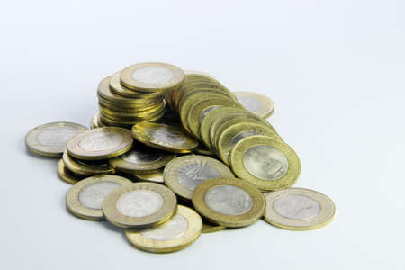 Coins stacked on each other in different positions on a white background