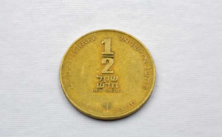 Modern Israeli coin half sheqel used closeup on the white background