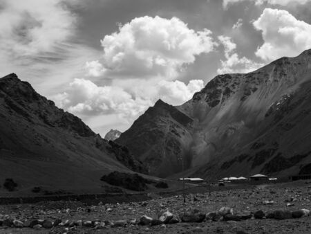 Black and white photo graphy of mountain range under the shadow of clouds in Ladakh Region, India