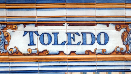 Tile with the name of the Spanish city of Tarragona on ceramic with a colorful decoration located in Spain Square in Seville