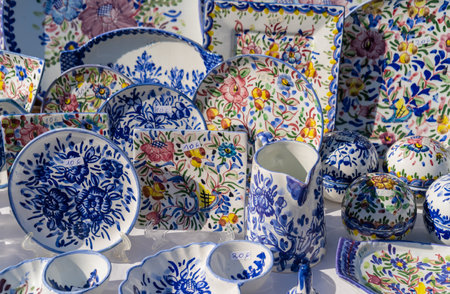 Valencia, Spain - 27.10.2019: Colorful traditional ceramic tiles and bowls for sale on the street of old town Valencia