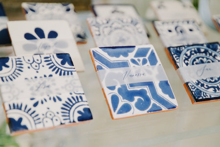 Colorful ceramic tiles featuring unique blue patterns are showcased at a local artisan market, attracting many visitors.