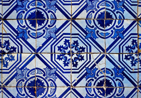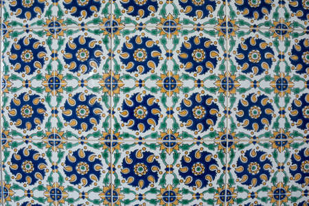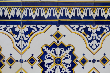Portuguese azulejo ceramic tiles, closeup photo of decorative, vintage, historic azulejos.