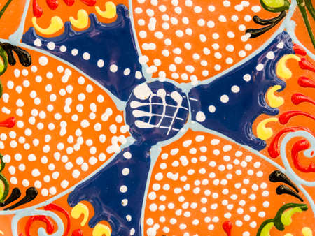 Colorful ceramic plate with floral ornament. Close-up. Select focus.