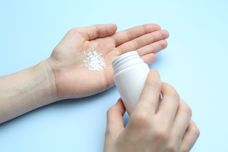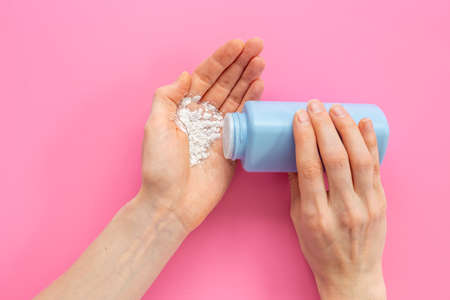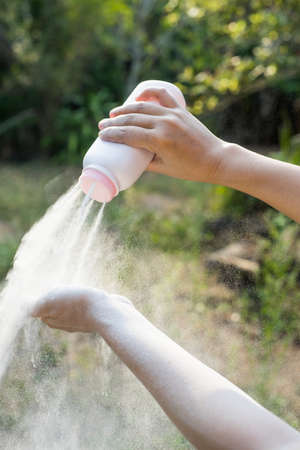 Woman applying baby talcum powder on hand. Skin care cosmetic