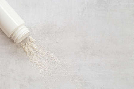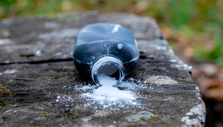 Black plastic bottle lies on its side, spilling white powder onto a rustic wooden surface outdoors