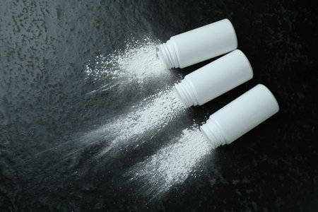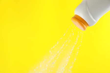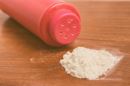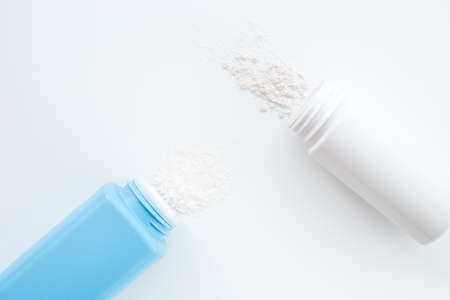 Spilled baby talcum powder in container. Kids skin care cosmetic