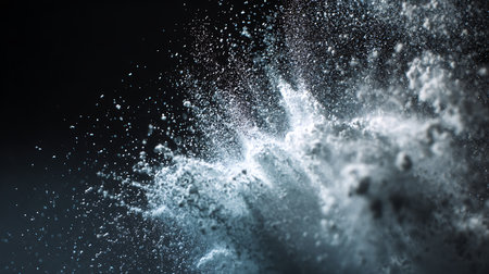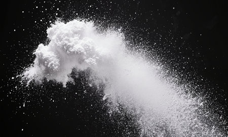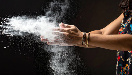 A dramatic, high-speed capture of hands clapping, creating an explosive burst of white powder against a stark black background.