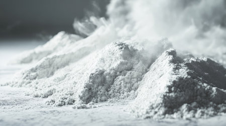 This image captures a fine white powder, creating soft mounds that release clouds of smoke, set against a gray background, ideal for culinary, food, or abstract themes.