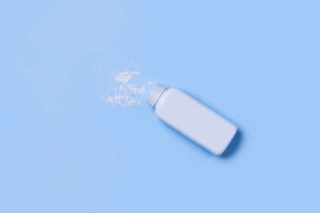 Baby powder on blue background. Top view. Baby talcum powder container. Baby powder with bottle or container on blue