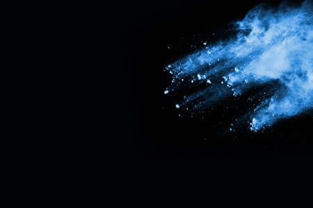 Blue powder explosion on black background. Colored cloud. Colorful dust explode. Paint Holi.