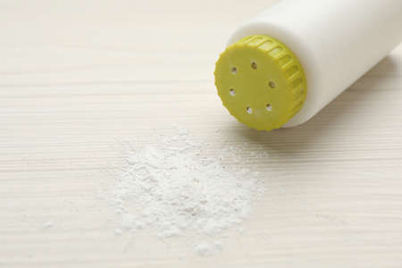 Bottle and scattered dusting powder on white wooden background. baby cosmetic product