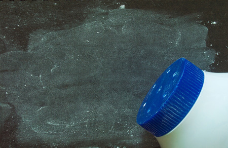The talcum powder for the body is covered with close-ups on a green background. Crumbly white powder from a plasmas white jar. Close-up of baby talc.