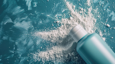 Bottle and scattered dusting powder on light blue background, top view. baby cosmetic product