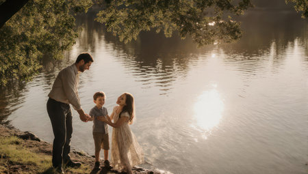 Father and children enjoying sunny day near tranquil lake, surrounded by trees and light
