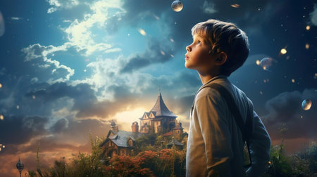 An AI generated illustration of a young boy looking up at the night sky on a rural landscape