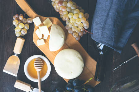 Cheese concept with famous georgian suluguni cheese in saperavi wine with fruits and spices on rustic background