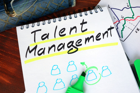 Handwriting Talent Management, Talent Needed, Talent Wanted on colorful note paper and notebook with wood background.
