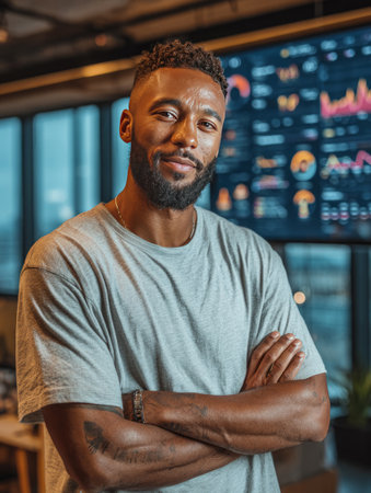Analyzing man in denim shirt studying data in office, with chart overlays, copy space. Collaboration, innovation, creativity, teamwork, modernity, productivity, data visualization