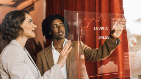 Reviewing professionals wearing business attire viewing bar chart overlay in office with smartphone. Collaboration, technology, data, innovation, teamwork, modernity, analytics