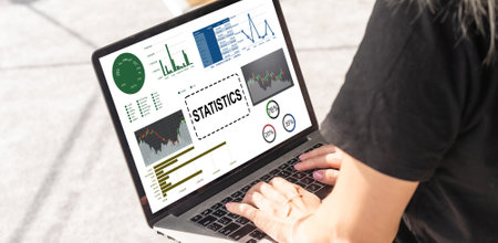 Analyzing office team collaborating on data charts at modern workspace, with laptop and graphs. Collaboration, teamwork, data visualization, modern office, business strategy, digital analytics, professional environment