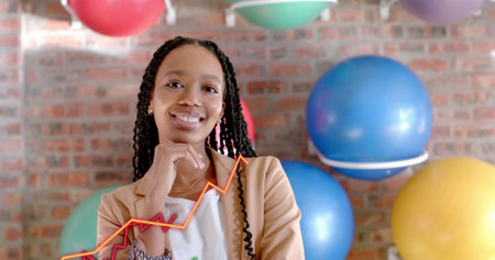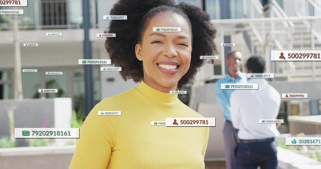 Image of icons and numbers with data processing over african american businesswoman. Global networks, business, finances, computing and data processing concept digitally generated image.