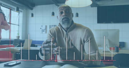 Image of statistical data processing against african american man and woman discussing at office. Business data technology concept