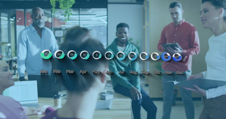 Image of financial data processing over diverse colleagues discussing work in office. Global business, finances and digital interface concept digitally generated image.