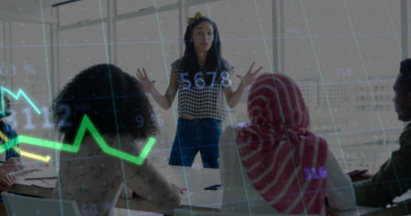 Image of data processing and diagrams over diverse colleagues discussing work. Global business and digital interface concept digitally generated image.