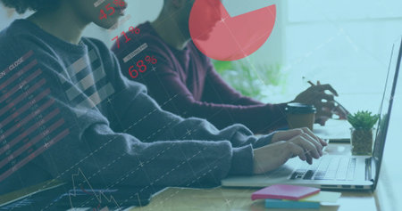 Image of financial data processing over diverse business people working in office. Global business, finances, computing and data processing concept digitally generated image.