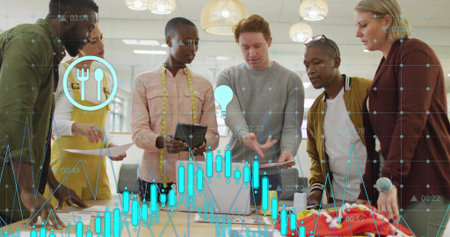 Image of financial data processing over diverse business people in office