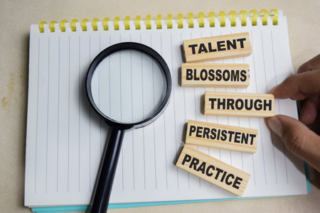Talent blossoms through persistent practice on stacked wooden cubes on the table. Business and finance concept