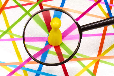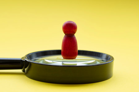 Red wooden figure on top of magnifying glass representing a leader or someone very important.