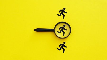 HR manager using magnifying glass to find human icons representing HR concepts like recruitment teamwork and leadership. Concept HR Concepts, Recruitment, Teamwork, Leadership, Human Icons