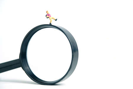 Finding school. A kid standing above magnifying glass. Miniature tiny people toys photography. isolated on white background.
