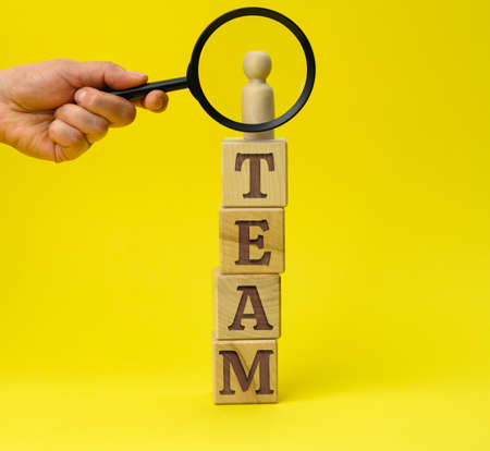 wooden figurine of a man on a pedestal and a hand with a magnifying glass on a yellow background. The concept of recruiting and finding talented employees, close supervision. Team building