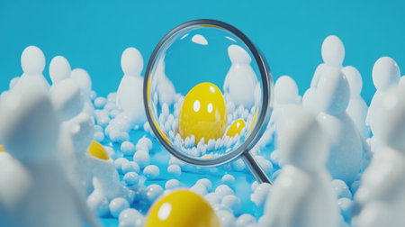 This image captures a yellow egg surrounded by white figurines, seen through a magnifying glass, symbolizing focus and uniqueness amid a crowd, perfect for creative projects.