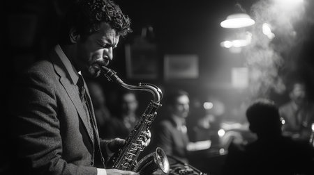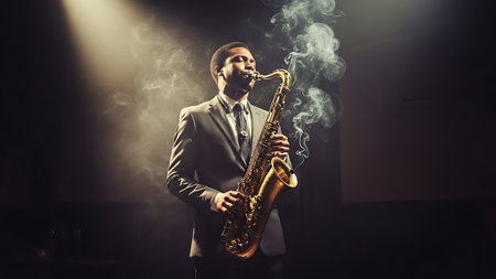 Saxophonist in spotlight at dimly lit jazz club mood-filled ambiance