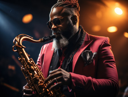 A talented musician plays the saxophone passionately, surrounded by glowing lights in a jazz venue.