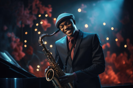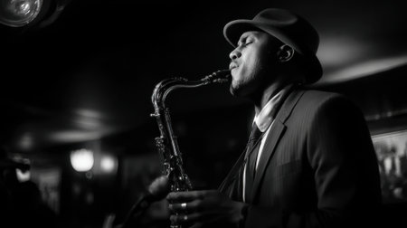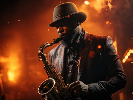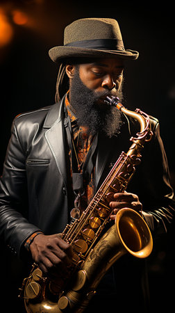 A talented jazz musician in a classic hat and stylish outfit playing the saxophone with passion. This image captures the essence of jazz culture, soul, and musical expression.