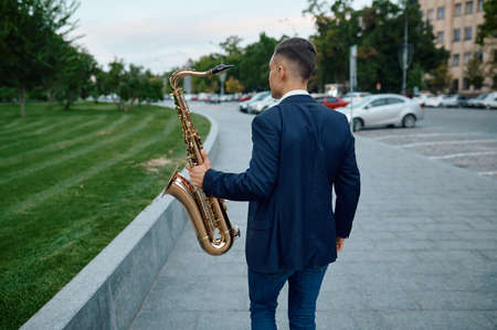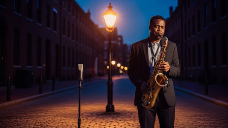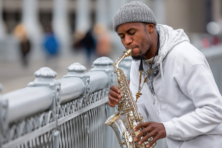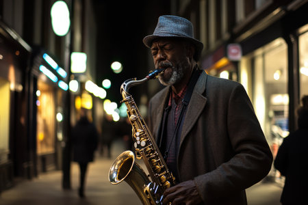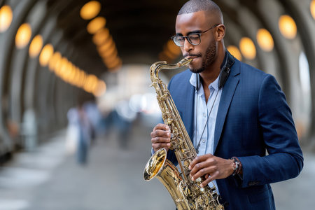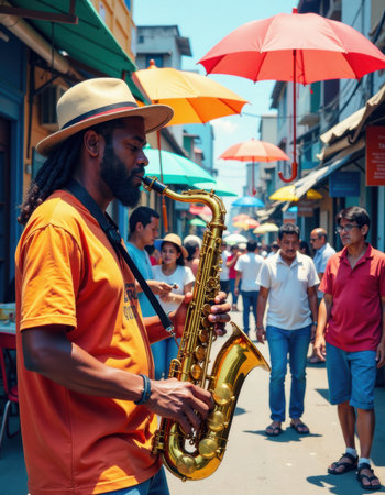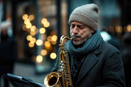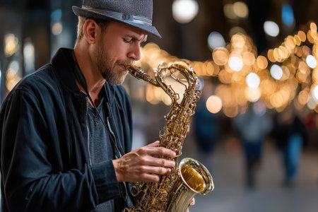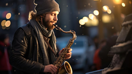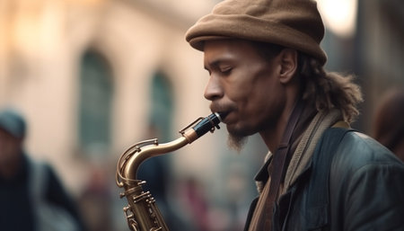 Street musician playing saxophone urban city street photography vibrant atmosphere close-up view celebrating culture