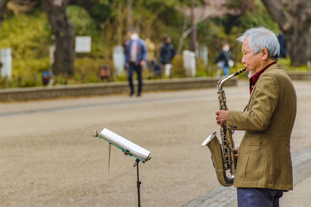 TOKYO, JAPAN, JANUARY - 2019 - Senior japanese man playing the saxophone at ueno park, tokyo city, japan