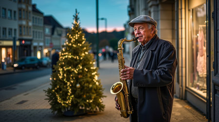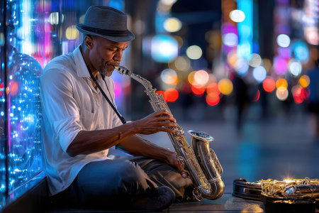 A talented saxophonist plays captivating melodies on a busy street filled with evening lights and passersby.