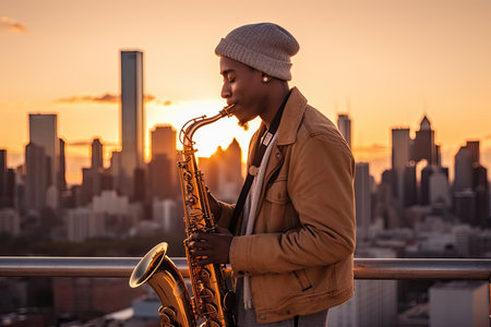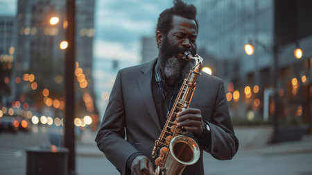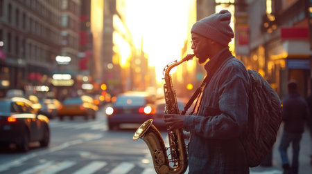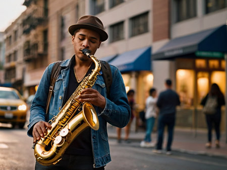 A musician with a saxophone delivers an emotive performance on city streets at sunset, merging art and urban culture