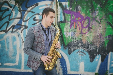 young boy playing the sax in the street in Ljubljana, Slovenia