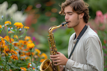 Harmonious Serenade: Talented Black Man Playing sax on a Beautiful Background. Generative AI