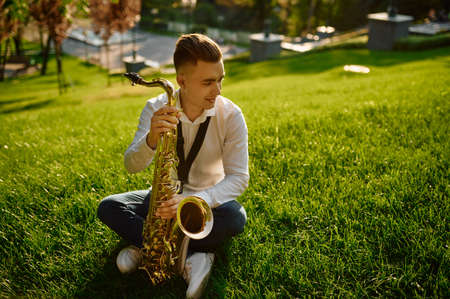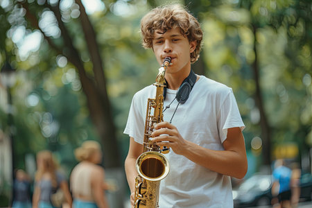 Young Man Playing Saxophone Outdoors in Urban Park with Blurred Background