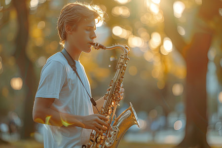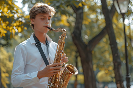 Young Man Playing Saxophone Outdoors Amidst Sunlit Trees in Casual White Shirt