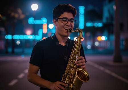 A cheerful saxophonist enthusiastically performs, dressed in vibrant attire and accompanied by a glowing bokeh background, embodying artistry and music.