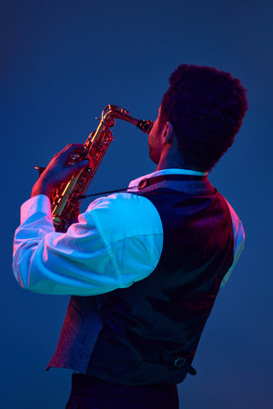 Rear view of man playing sax performing jazz melodies against vibrant blue background in mixed pink-purple background. Concept of jazz, blues, classy instrumental music, festivals and concerts. Ad